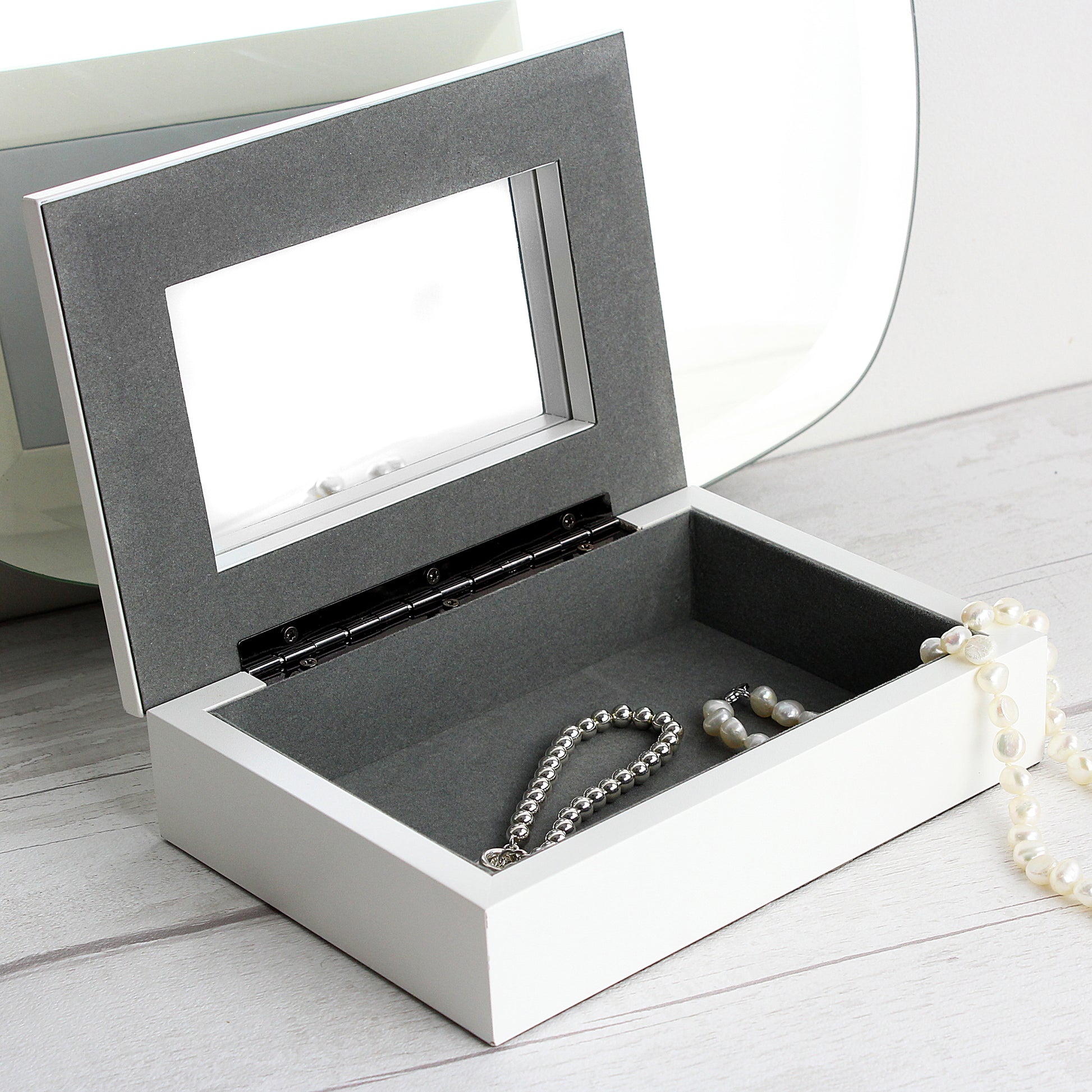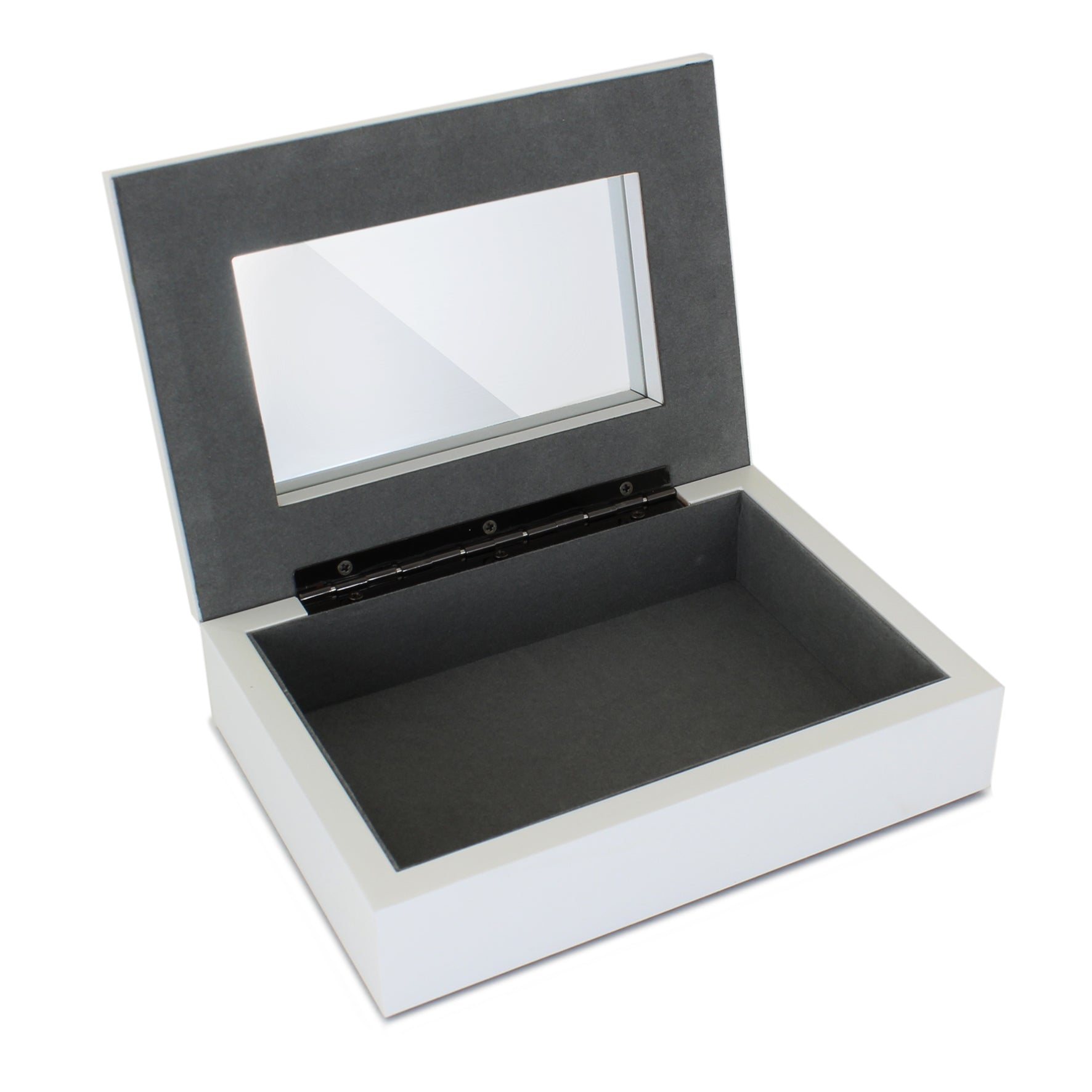 The wooden jewellery box has a large compartment with a mirror in the lid.