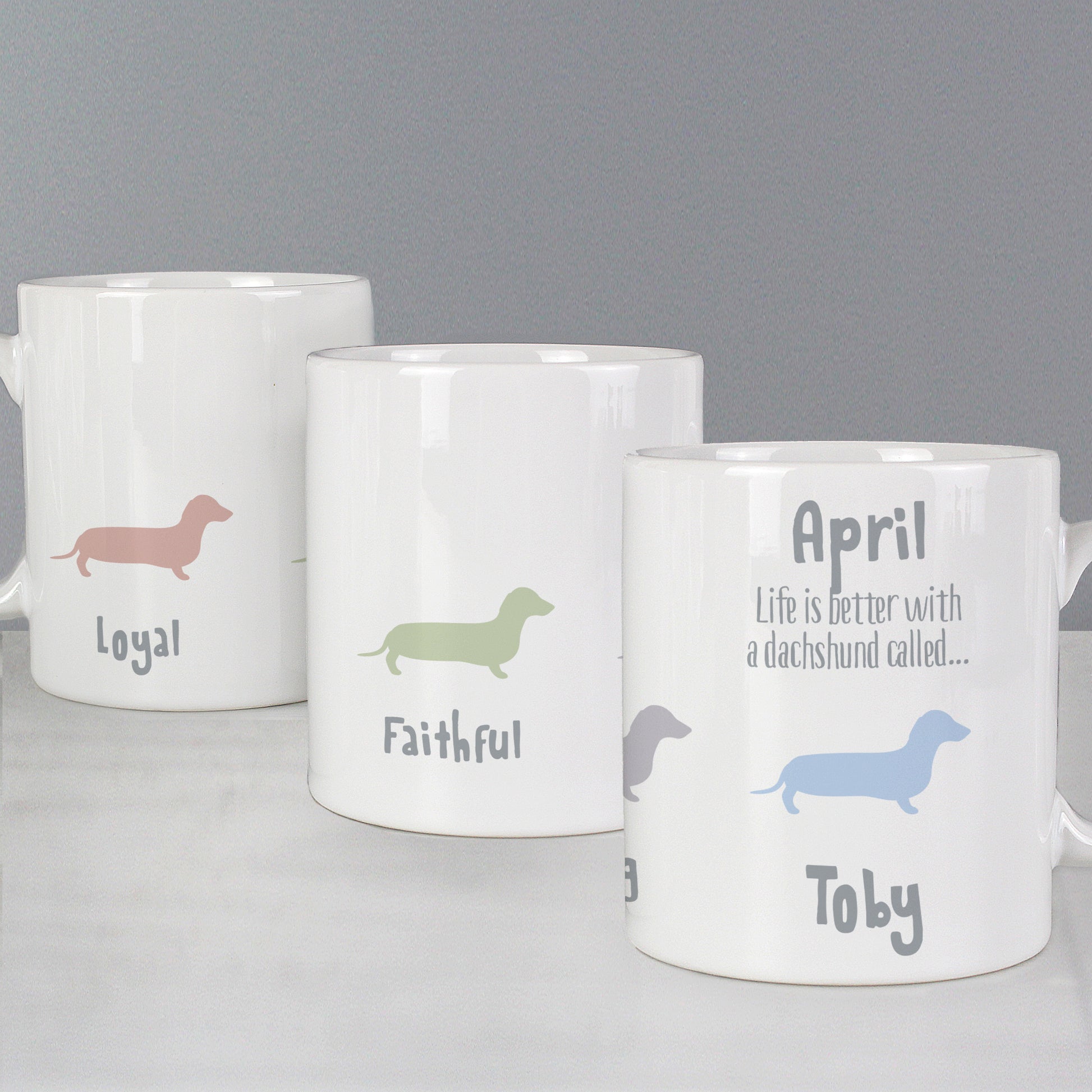 This Dachshund Mug can be personalised on the front with 4 lines of text. Line 1 & 4 (the names) can hold up to 15 characters per line and Lines 2 & 3 can hold up to 40 characters per line. You can then have 3 descriptive words which can hold up to 12 characters each.