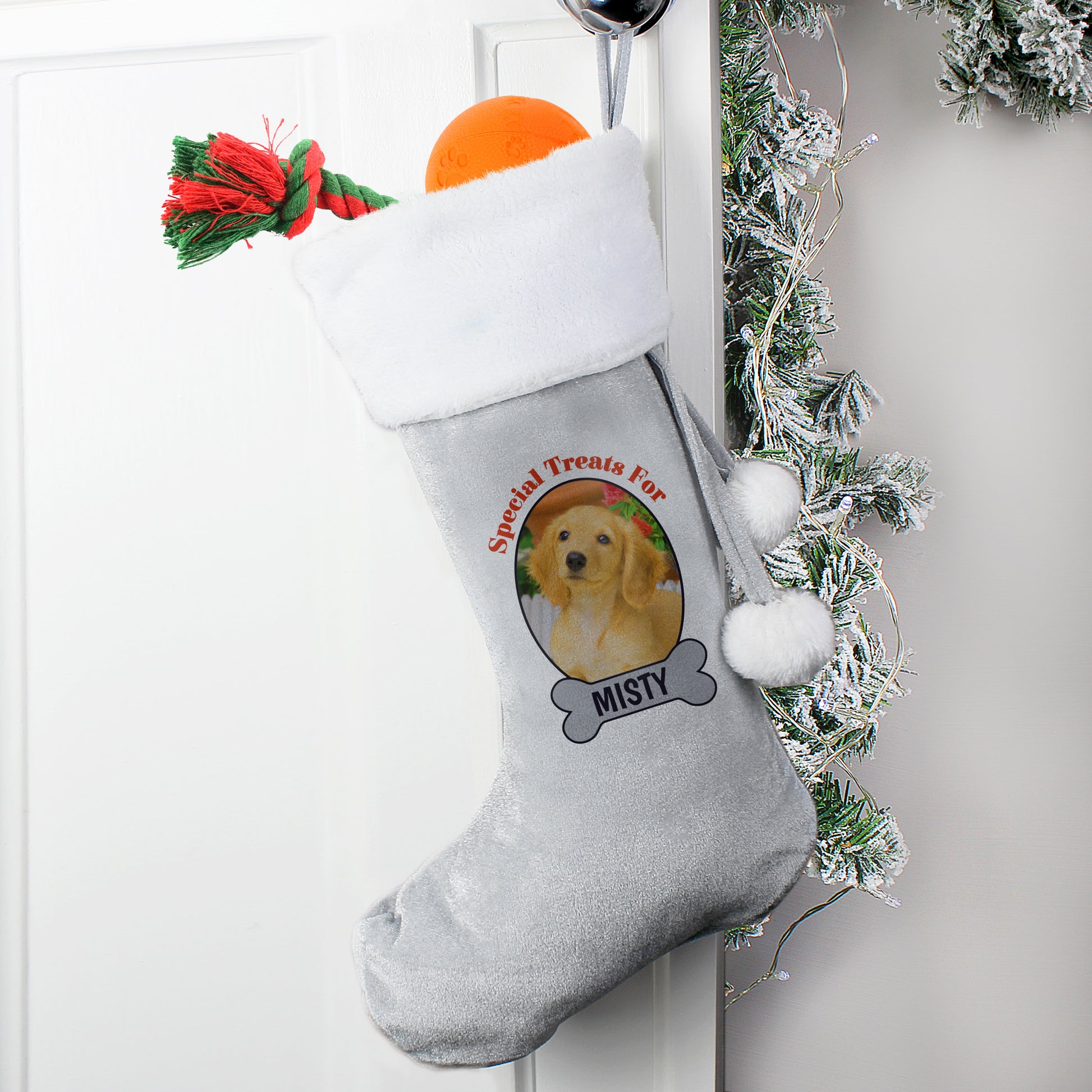 Our Personalised Dog Photo Upload Silver Grey Stocking is a great way to present your pets Christmas treats from Santa.