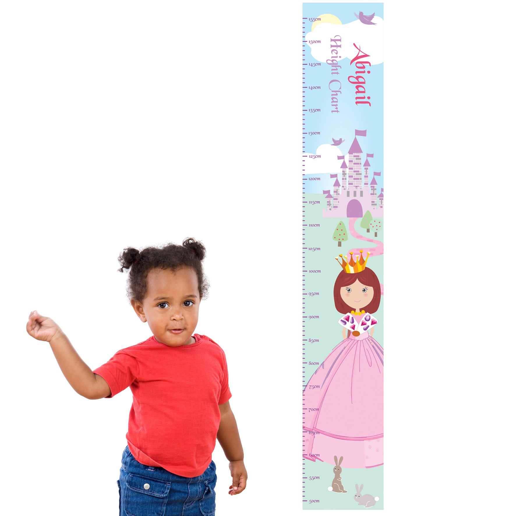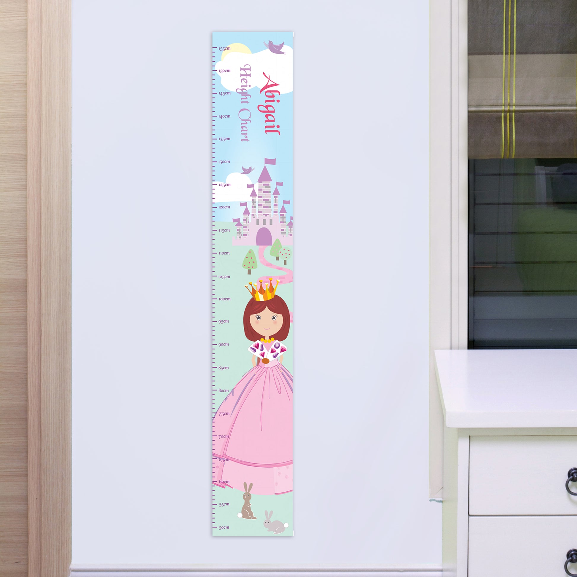 Personalise Fairy Tale Princess Height Chart with a name using up to 12 characters and small message using up to 15 characters (for example, 'Height Chart' 'Happy Birthday' 'Growing fast' 'Love Mum and Dad'.