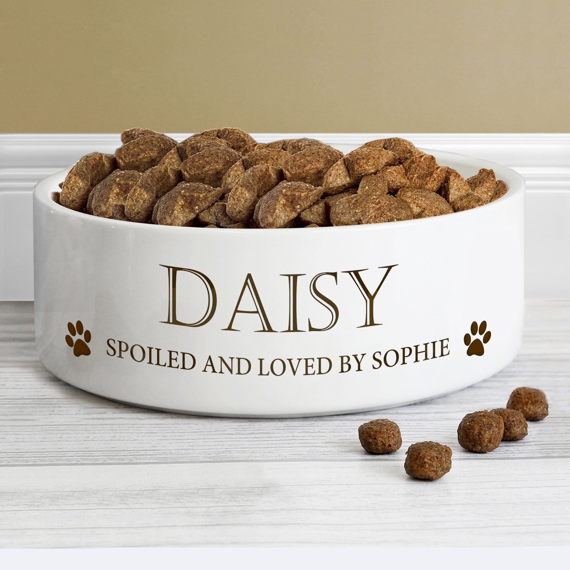 Our Paws 14cm Medium White Pet Bowl can be personalised with a name up to 12 characters and a line of text up to 30 characters in length.