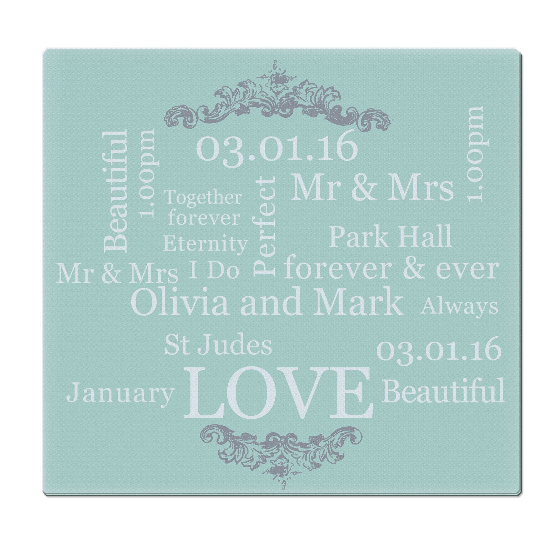 The words 'LOVE', 'I DO', 'Beautiful', 'forever & ever', 'Always', 'Together forever', 'Eternity' and 'Perfect' are fixed. You can then personalise as listed below: